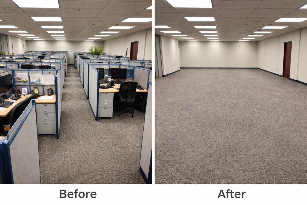 - Cubicles, partitions, carpets, and curtains removal